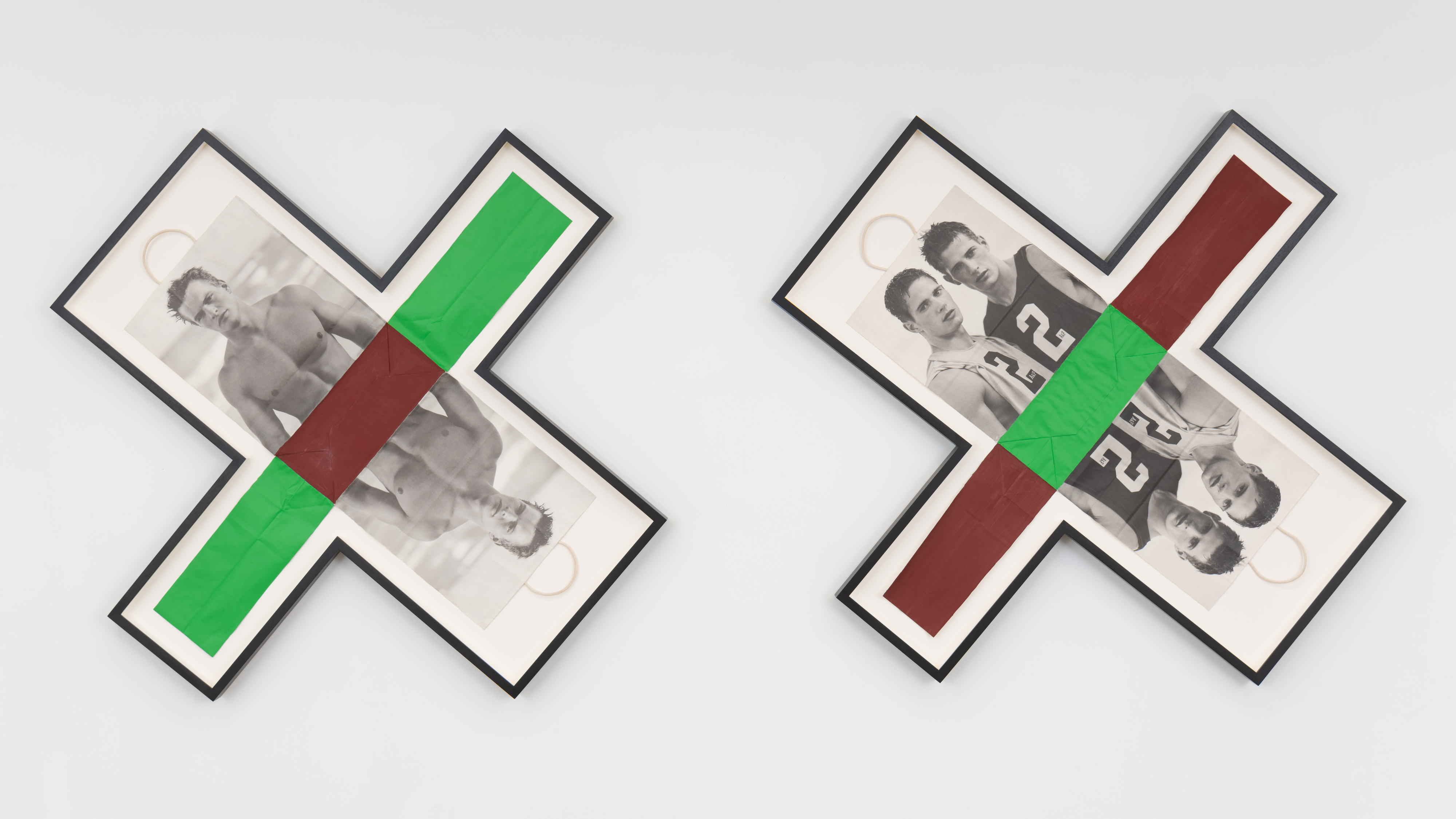 In Love and Theft, Gray Wielebinski develops his ongoing investigation into the mythological and material foundations of the nation-state. Its altar-like centerpiece evokes the romantic image of American farmland through use of two colors: falu red, the earthy tone typically used to paint barns, and chroma key green, used for green screen filming and reminiscent of the unnerving sheen of a perfectly manicured lawn. Overlaying these colors onto disassembled shopping bags from the quintessentially American retailer Abercrombie & Fitch, Wielebinski invites reflection on the physical and economic histories lying behind an idealized national identity. Both colors are tools for the creation of fantasy, albeit in starkly opposed ways. Falu red, a milk paint, reflects the organic tones of the Earth’s landscape and is in this sense designed to operate as a non-color; chroma key green, on the other hand, is vividly unnatural yet made to disappear in the green screen process. The highly recognizable Bruce Weber-shot photographs adorning the bags, meanwhile, evoke the homoerotic undertones of normative masculinity.