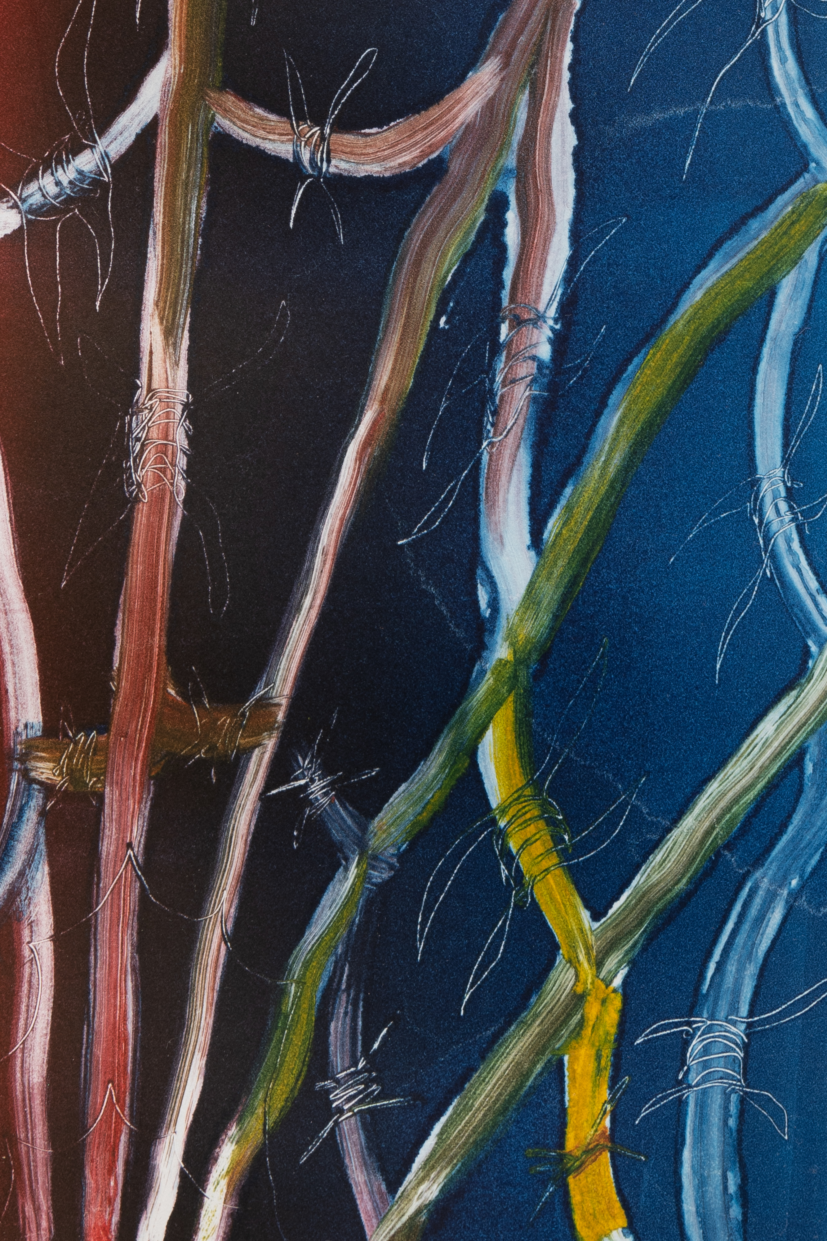 Flanking Love and Theft’s eponymous centerpiece are a series of prints that take Wielebinski’s foray into the import of color to intense, dream-like heights. Through the medium of print, Wielebinski plays on the way particular images become enshrined in collective consciousness, denoting a sense of national identity. The exhibition’s title, lifted from the scholar Eric Lott’s canonical study of appropriation, captures the ambivalent feelings of desire, envy, delusion, and violence that undergird the concept of ownership. By manipulating these symbols—repeating, distorting, splicing, and recombining them—Wielebinski toys with the ideas of ownership and appropriation encoded in the show’s title. Here Wielebinski extends his interest in the aesthetics of fencing and the history of barbed wire, the tool by which the American landscape was domesticated by European colonizers. We find barbed wire in both familiar and unrecognizable states, in one case enlarged to a point of terrifying majesty suggestive of a tornado (thus recalling the ultimate futility of settler attempts to gain mastery over the natural landscape). Love and Theft foregrounds the images that haunt us, the past that cannot be buried, and the mutual implication of violence and possession.