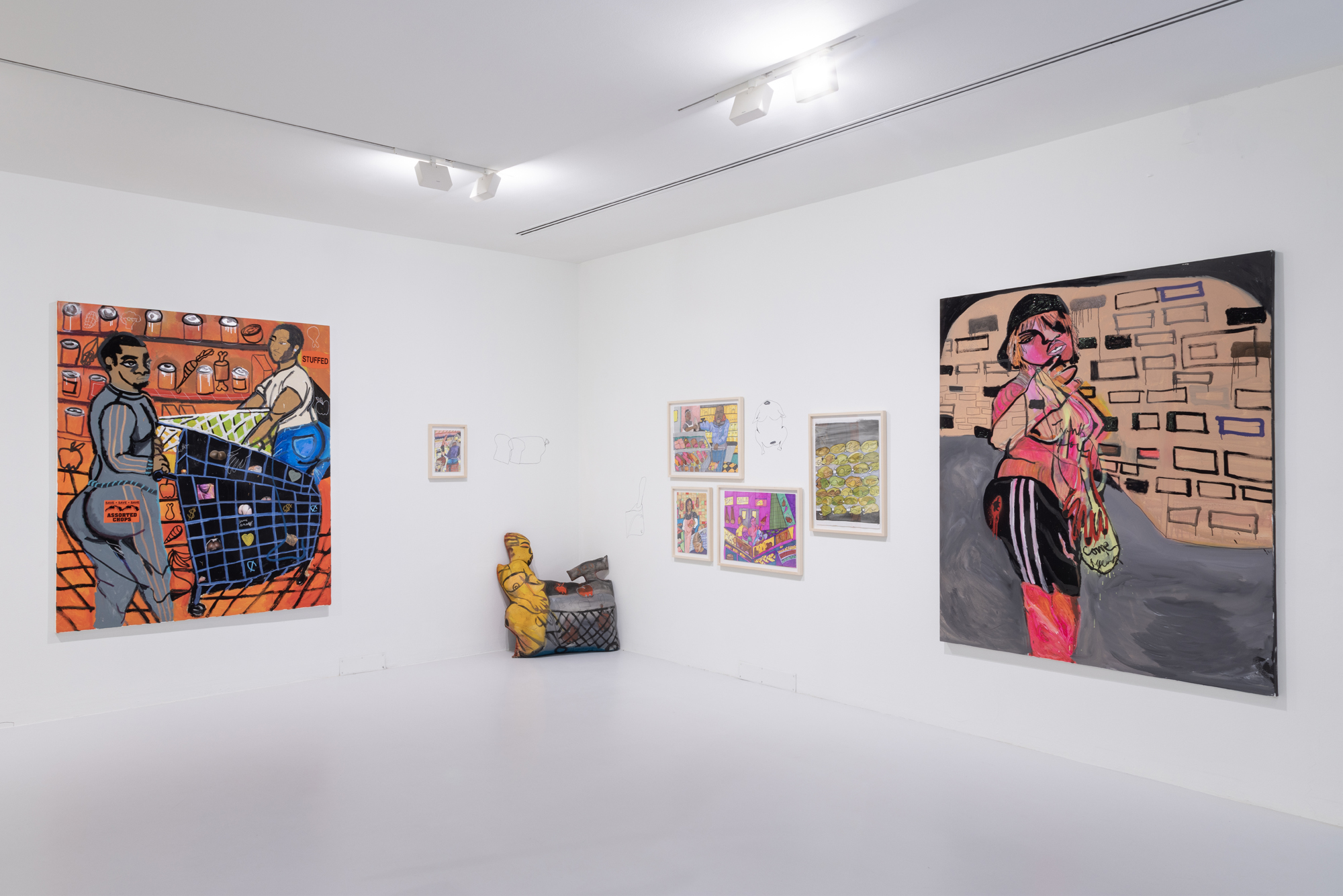 The show features new and recent works selected in close dialogue with the participating artists. Spanning painting, collage, sculpture, video and installation, these pieces articulate different atmospheres across three floors of the gallery. Bodily postures form a motif across the show, contemplating the significance of certain actions – such as standing, posing, sleeping, hitting, or embracing – in connection to interpersonal hierarchies and emotional language.